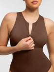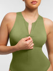 Designed for real life, this seamless ribbed bodysuit offers convenience, comfort, and contour in one sleek piece.
